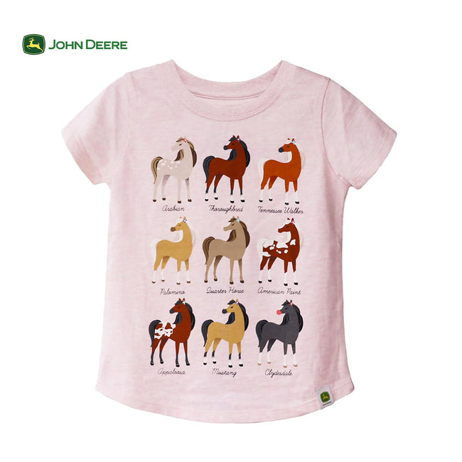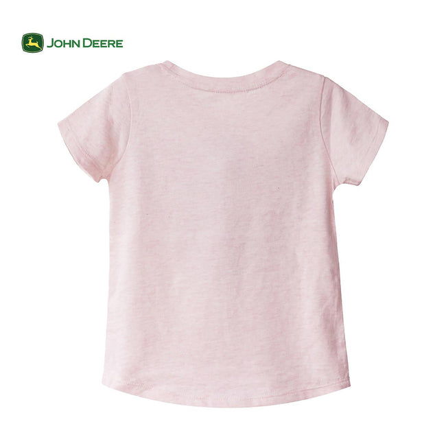 Toddler girl’s short sleeve has a screenprint with all the farm and garden essentials. The t-shirt is a light heather grey glitter is super soft and features a set in rib collar for all day comfort. Rounded hem with a John Deere branding twill tab label on the bottom hem.
