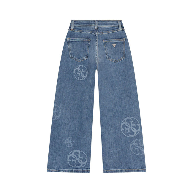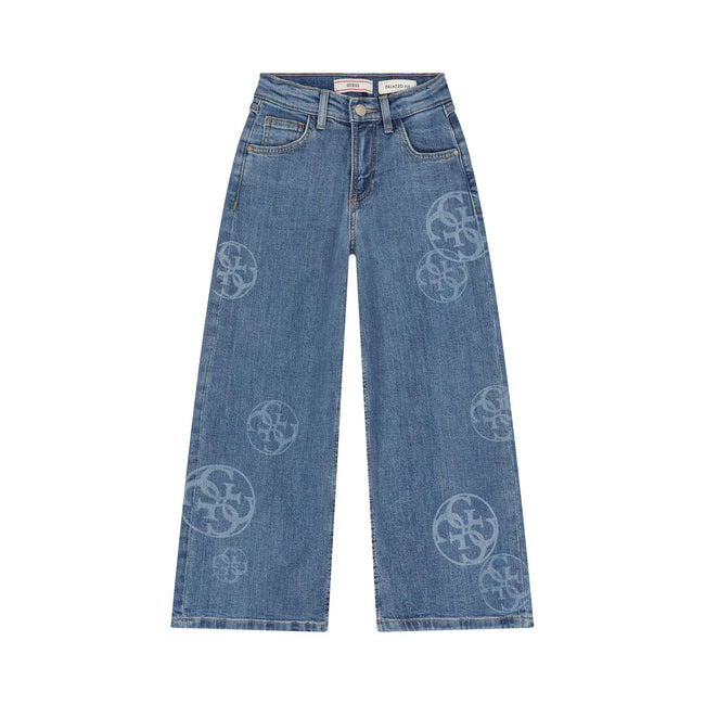 Blue jeans for girls by Guess. Made from soft denim with all-over 4G logo pattern. They feature the brands triangle logo badge at the back. They have classic five pocket styling and a comfortable adjustable waist and concealed zipper fly with top button closure.